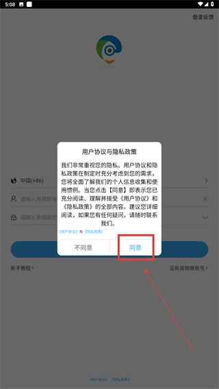 在仔细阅读《用户协议》和《隐私政策》后,点击【同意】按钮,即可进入易微联的登录环节。
