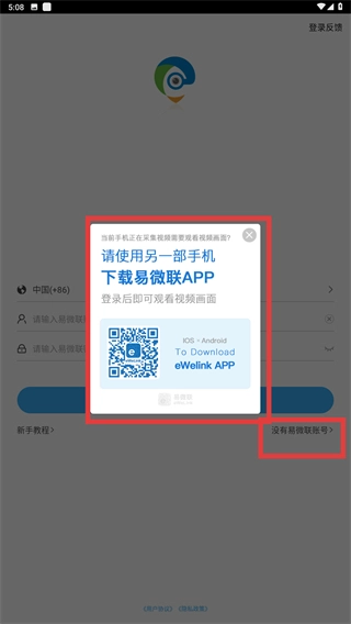 若要查看视频画面,可点击【没有易微联账号】,随后按照提示用另一部手机扫描易微联的二维码,完成登录操作后就能进行查看了。