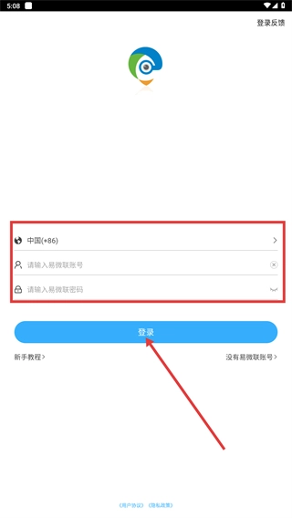 在登录界面,选择地区为【(+86)】,输入易微联账号和密码,点击【登录】按钮进入系统。
