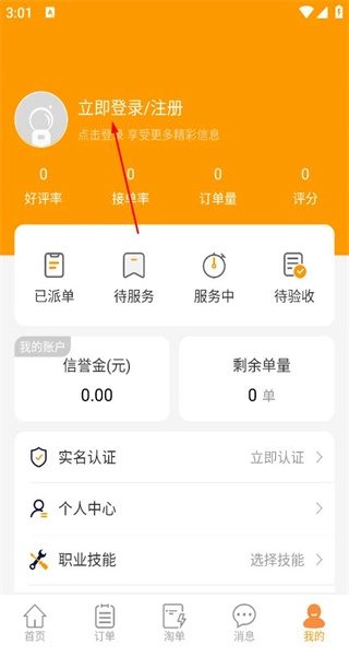 进入我的页面后,能看到“立即登录注册”的提示以及“已派单”等选项,点击这个提示就可以进入对应的登录操作页面。