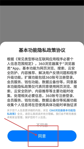 当【360浏览器】弹出【基本功能隐私政策协议】的窗口时,你需要先阅读相关条款,之后点击【同意】按钮,这样就能进入应用了。