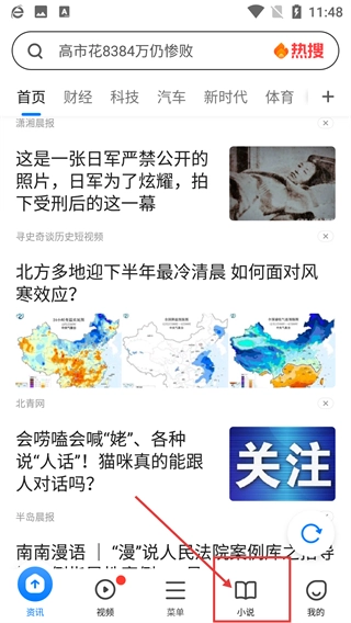 在资讯页面,点击底部导航栏的【小说】选项,就能进入对应的小说功能页面,之后可以进行书籍相关操作。