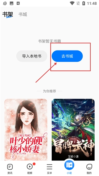 进入小说的【书架】页面,要是书架里还没有添加任何书籍,点击【去书城】按钮,就能进入书城页面挑选各类小说书籍。