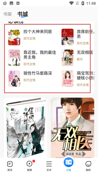 在【书城】页面,能够浏览【现代言情】-【都市】等类别的小说作品,挑选感兴趣的书籍开展阅读相关操作。