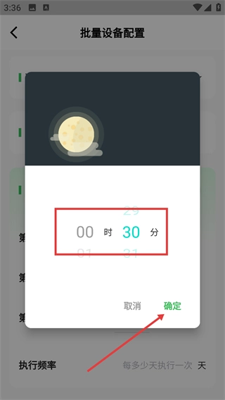 当时间选择弹窗弹出后,对时间参数进行调整(例如将其设置为00时30分),接着点击【确定】按钮,这样就完成了时间选择操作。
