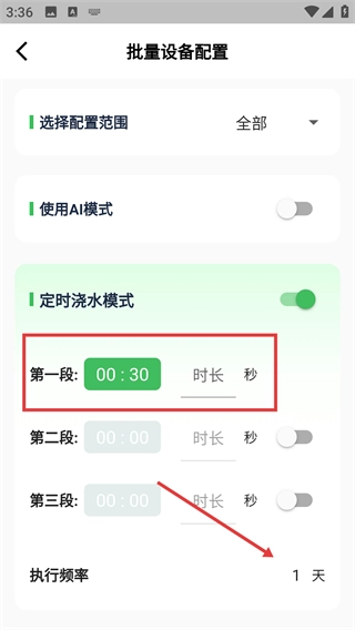 设置完成后,可在【执行频率】处配置浇水周期(例如1天),以此完成批量浇水设备的参数配置。