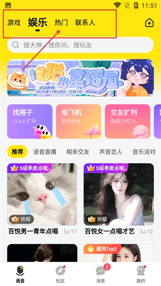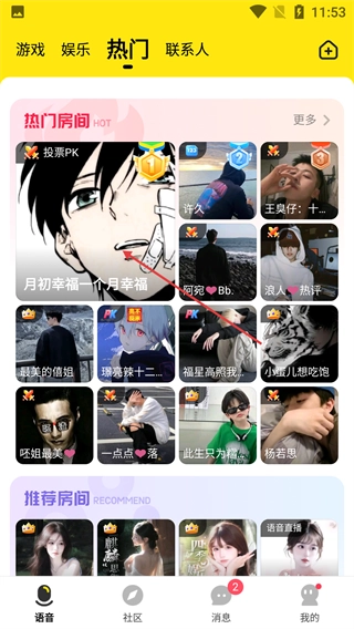 在语音应用的语音页面,点击顶部的【热门】标签,切换到热门板块后,就能看到当前热门的互动房间列表。