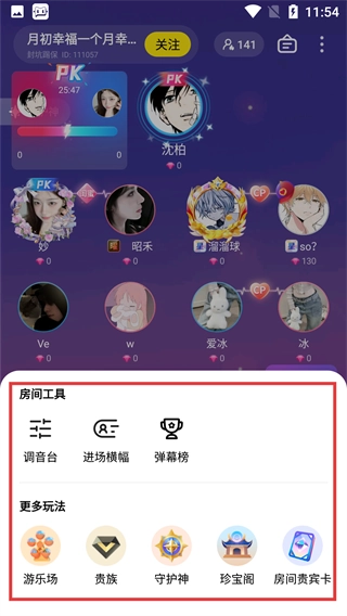 在展开的菜单里,能借助【调音台】【进场横幅】这类房间工具来辅助互动,还可以尝试【游乐场】【贵族】等其他更多玩法。