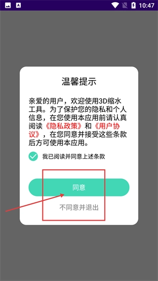 当出现【温馨提示】弹窗时,先勾选【我已阅读并同意上述条款】选项,再点击【同意】按钮,就能进入【3D缩水工具】应用了。
