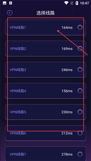 进入【选择线路】页面,在【VPN线路1】至【VPN线路7】等选项里选定所需线路,操作完成后返回【加速器】页面继续后续步骤。