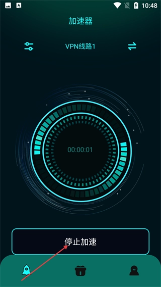 在【加速器】页面,选定【VPN线路1】后进入加速状态,计时开始,点击【停止加速】按钮可终止当前加速进程。
