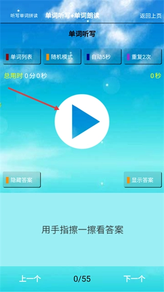 点击【前去单词听写】选项,进入单词听写功能页面后,就能开启单词听写练习流程。