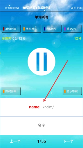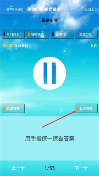 在练习时,如果需要核对内容,点击【显示答案】按钮,就能查看当前单词的拼写、音标以及释义。
