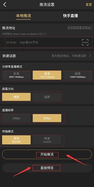 设置推流地址及参数(分辨率、分享、帧率、模式);