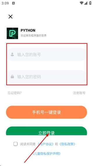 在登录界面输入手机号与密码,勾选相关协议后,点击登录按钮即可完成账号登录流程。