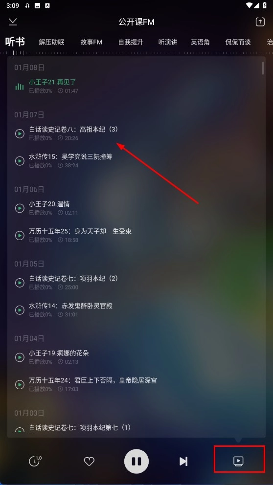 4、在音频列表中,点击目标音频(例如“白话读史记卷八:高祖本纪(3)”),即可切换收听该音频。