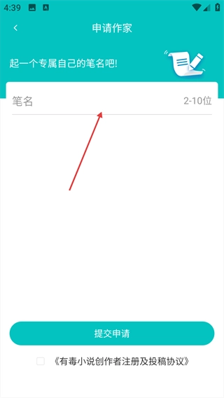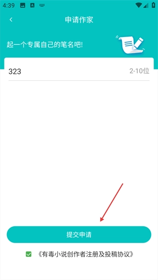 3、填写完笔名后,点击【提交申请】按钮,完成作家身份的申请提交。