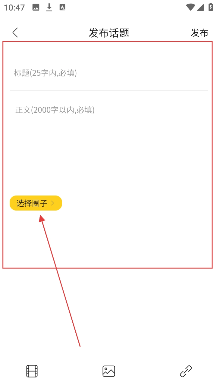 3、进入发布话题页面后,填写好标题与正文内容,接着点击【选择圈子】按钮,就可以开始选择该话题对应的所属圈子了。