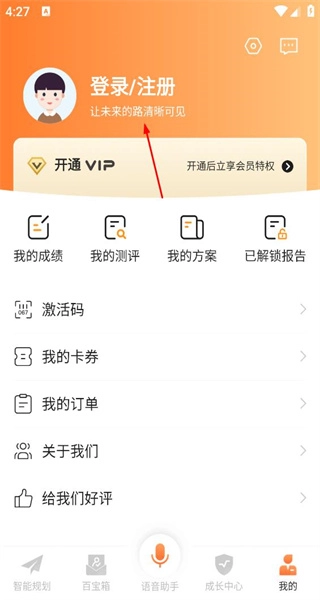 2、进入“我的”页面后,能看到登录注册提示、我的成绩、我的测评等选项,点击登录注册区域即可进入登录页面。