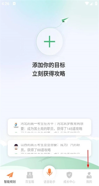 打开软件后,进入智能规划页面,看到“添加目标立刻得攻略”的提示,接着点击底部的“我的”,进入个人相关页面。