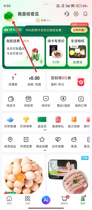 1、打开【叮咚买菜】App后,点击主页左上角的头像。