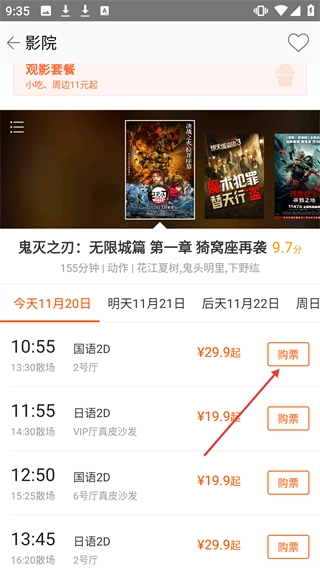 4、挑选合适的场次(比如国语2D、日语2D这类场次),点击【购票】按钮,进而完成电影票的购买流程。
