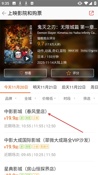 3、挑选目标影院(例如中影影城(春风里店)),进入该影院的场次页面。