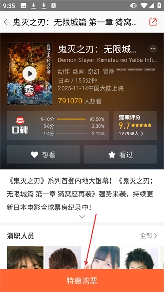 2、在影片详情页点击【特惠购票】按钮,即可进入上映影院及购票页面。