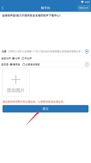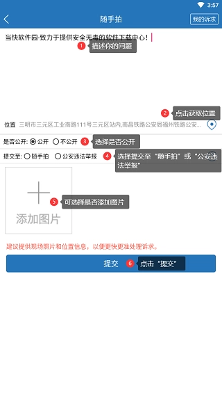 2、在你完成问题描述后获取位置信息,接着点击选择是否公开以及投诉类型,另外你也可以上传问题相关的图片。