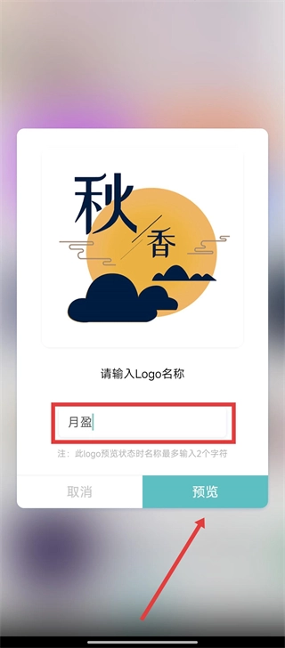 2、在输入框中填写Logo名称,比如【月盈】,接着点击【预览】按钮,查看一下呈现的效果。