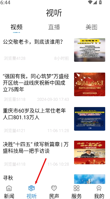 2、在页面上方找到“视听”入口,点击即可进入直播、视频等板块,观看本地节目及相关主题影像内容。