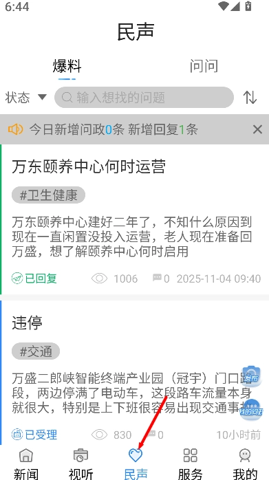 3、在首页的栏目里找到“民声”板块,你可以选择爆料或者问问的入口,提交问题、反馈相关情况,也能查看公共话题的讨论内容。