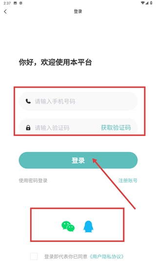 3、切换到手机验证码登录模式,输入【手机号码】后点击【获取验证码】,填写验证码完成后点击【登录】,此外还能选择微信/QQ授权登录。