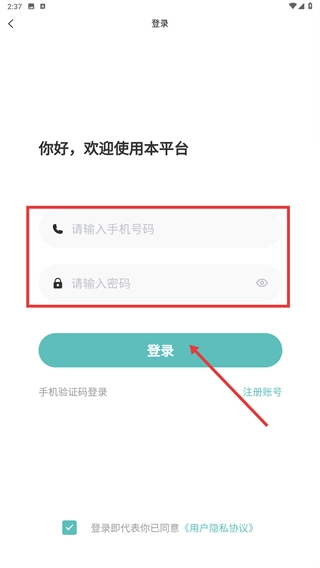 2、进入密码登录页面后,依次填写【手机号码】与【密码】,勾选同意相关协议,随后点击【登录】按钮即可完成验证流程。