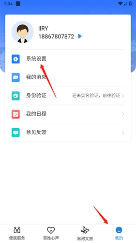 1、打开“我的黑河”应用,点击底部导航栏的“我的”选项,接着点击“系统设置”选项;