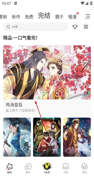 3、进入完结漫画页面后,浏览页面上展示的作品列表,从中找到《鸡汤皇后》这部作品并点击,进入该作品的详情页面。