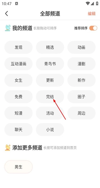 2、在所有频道页面里,找到完结频道这一选项,点击它就能进入完结漫画的展示页面。
