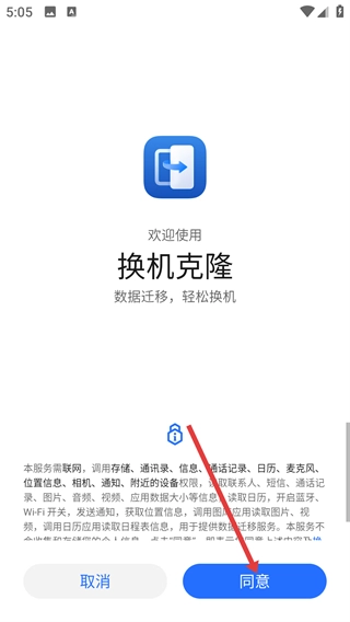 1、打开【换机克隆】后,要仔细阅读包含存储、通讯录等内容的权限说明,随后点击【同意】按钮,这样才能启用数据迁移服务。