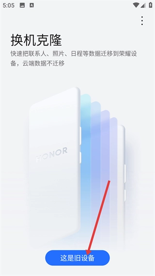 2、进入【换机克隆】主界面后,点击【这是旧设备】选项,借助该功能能够将联系人、照片等数据迁移到荣耀设备上。