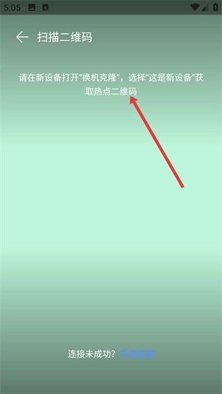3、进入【扫描二维码】页面后,需在新设备上打开同款应用并选择【这是新设备】以获取二维码;若连接失败,可通过手动方式进行连接。