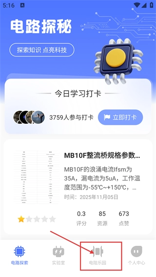 1、打开“电路探秘”应用的首页后,点击底部的【电阻乐园】选项,即可进入该应用中与电阻相关的内容板块。