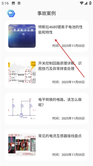 进入电阻乐园页面后,找到并点击【事故案例】选项,即可进入事故案例的内容列表页面。