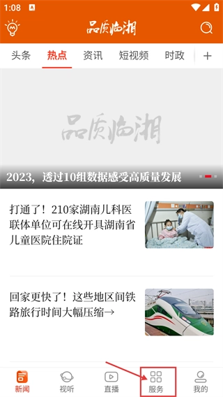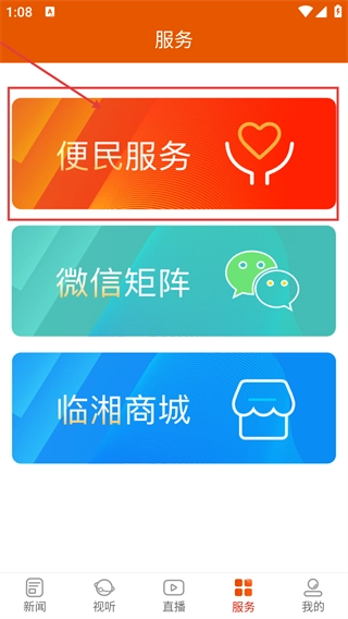 在“品质临湘”新闻页面底部找到【服务】入口,点击后即可进入服务功能页面,在该页面能获取到便民、商城等各类服务选项。
