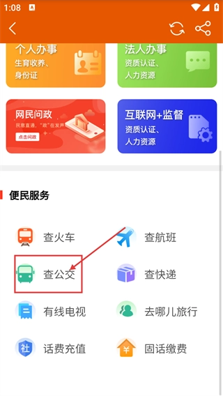 3、在便民服务板块里找到并点击【查公交】选项,就能进入公交查询页面,查看实时的公交路线动态信息。