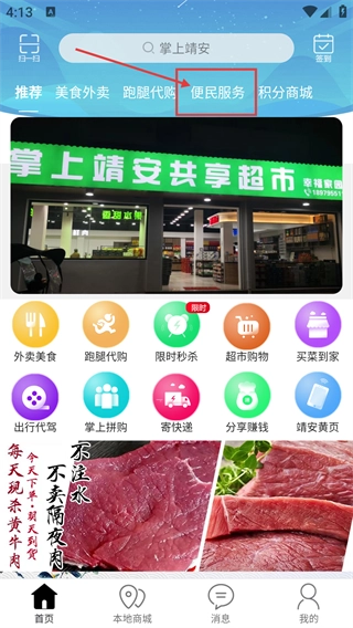 1、打开掌上靖安APP进入首页,找到顶部导航栏中的【便民服务】选项并点击,即可切换到便民服务板块。