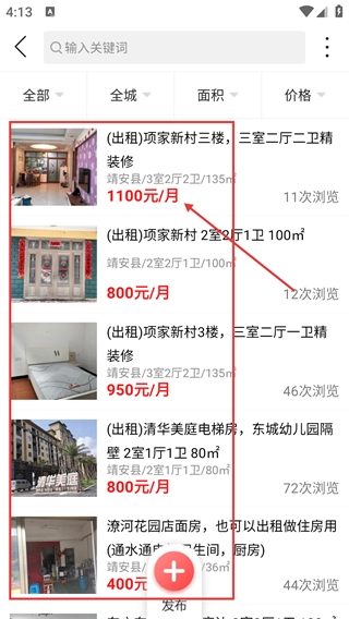 3、在房屋出租列表页面,能够借助全部、全城、面积、价格等筛选条件来缩小搜索范围,选定目标房源后,点击即可进入该房源的详情页。
