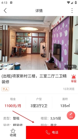 4、进入房源详情页面,浏览租金、户型、面积等信息后,点击【电话】按钮,就能联系出租方洽谈租房相关事宜。