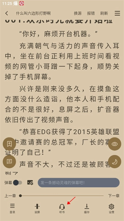 1、进入小说阅读界面后,轻点屏幕呼出菜单,接着点击下方的听书选项。