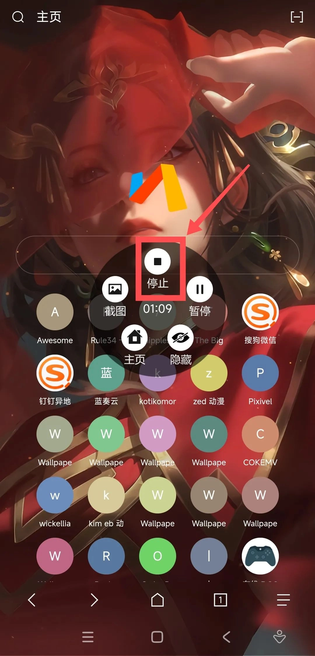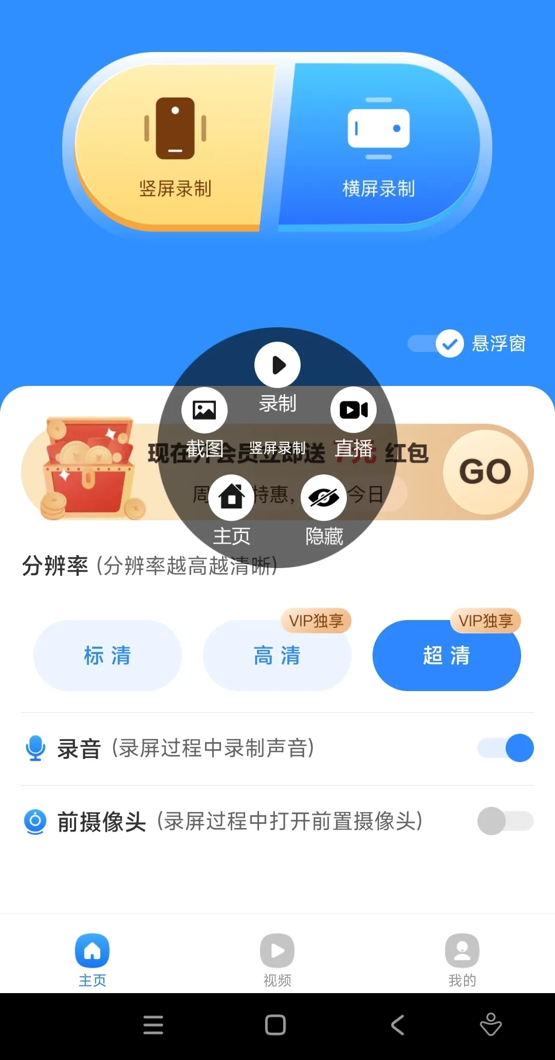 3. 悬浮窗具备截图、录屏、直播等功能,点击“录制”按钮即可启动屏幕录制。