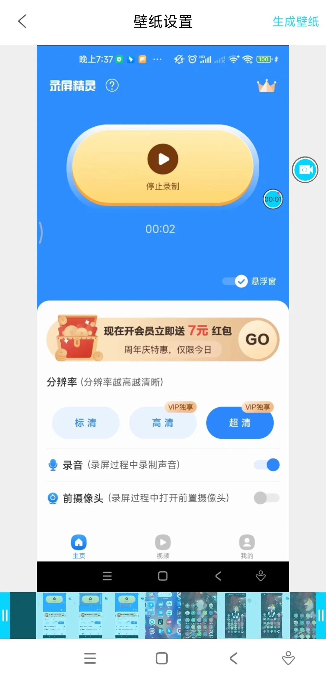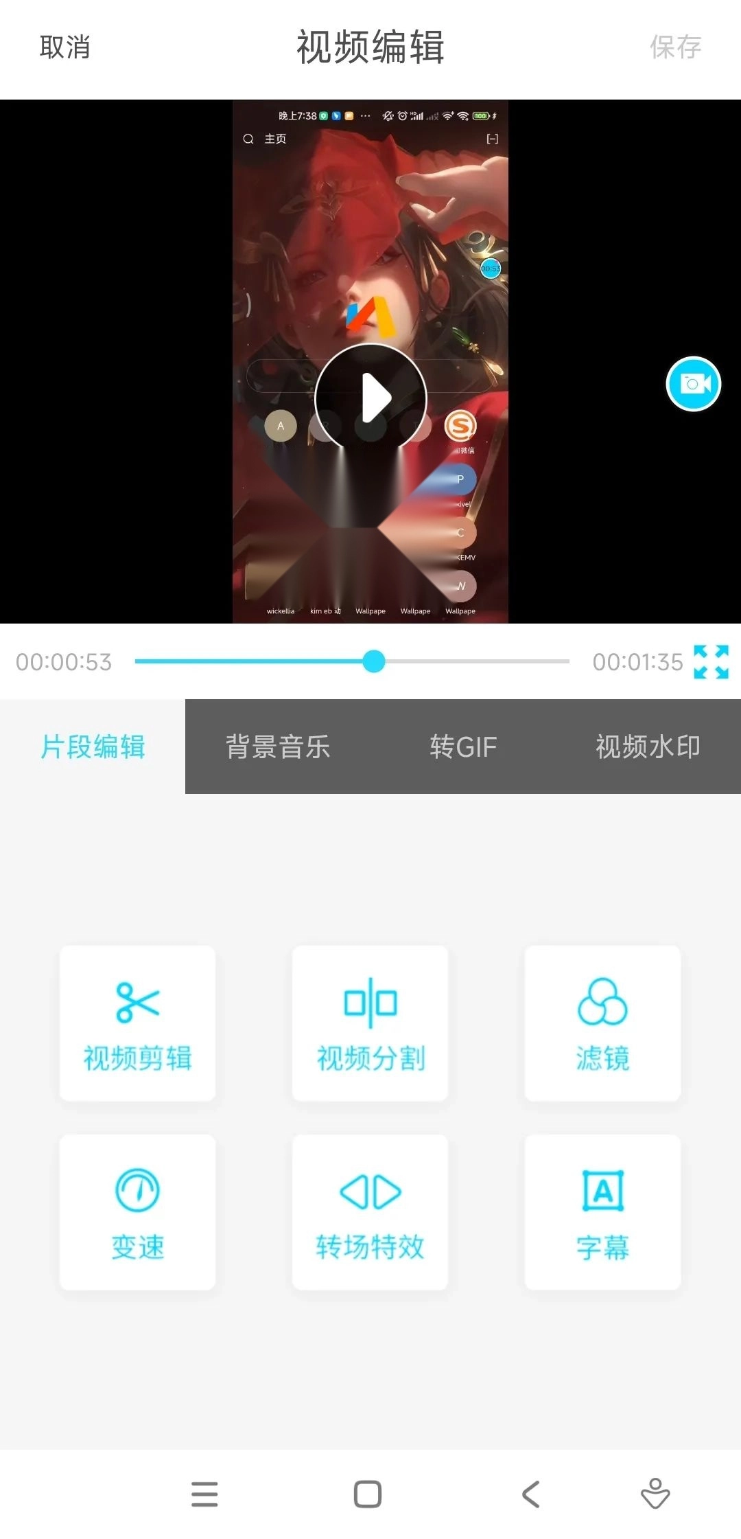 6. 点击风车样式的图标可以将视频生成为视频壁纸。